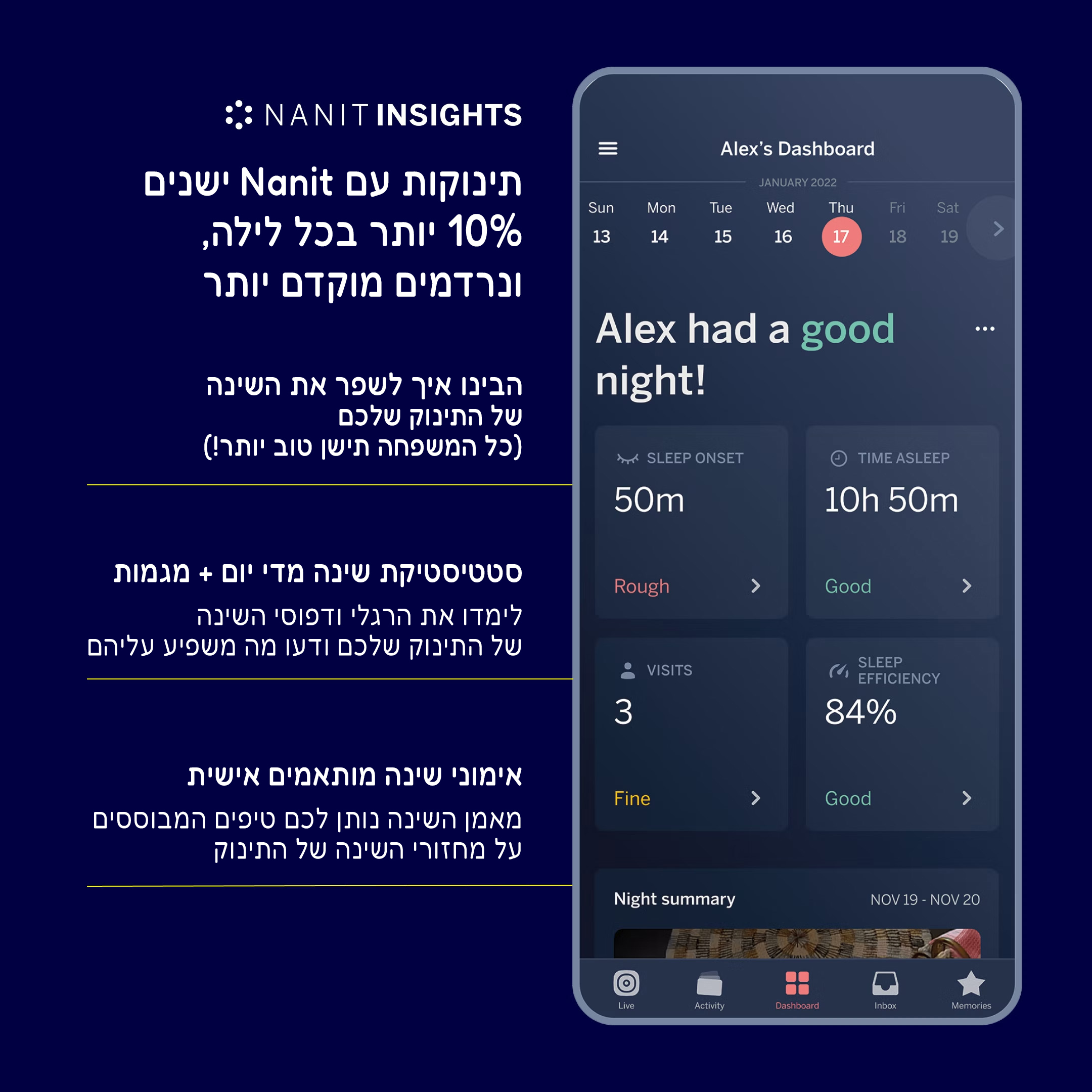 Nanit Insight – תכנית המעניקה לכם גישה להיסטורית הוידיאו, קטעים נבחרים מאירועי הבוקר והערב, מעקב שינה, איפיון, טיפים והדרכת שינה מותאמת אישית. ניטור תנועת נשימה (עם הבגדים מנטרי הנשימה של Nanit). בקניית Nanit PrO תקבלו שנה בתכנית Nanit Insight.